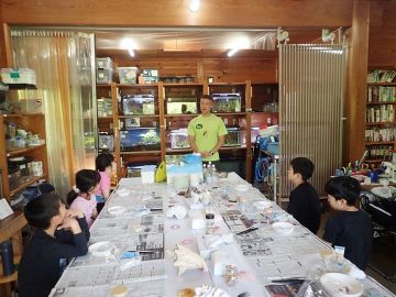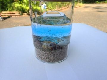 磯や浜辺にどんな生き物がいて、どんな生活をしているかなどの話を聞いて、ガラス容器に貝殻を飾りゼリーキャンドルで固めたアクアリウムを作りました。